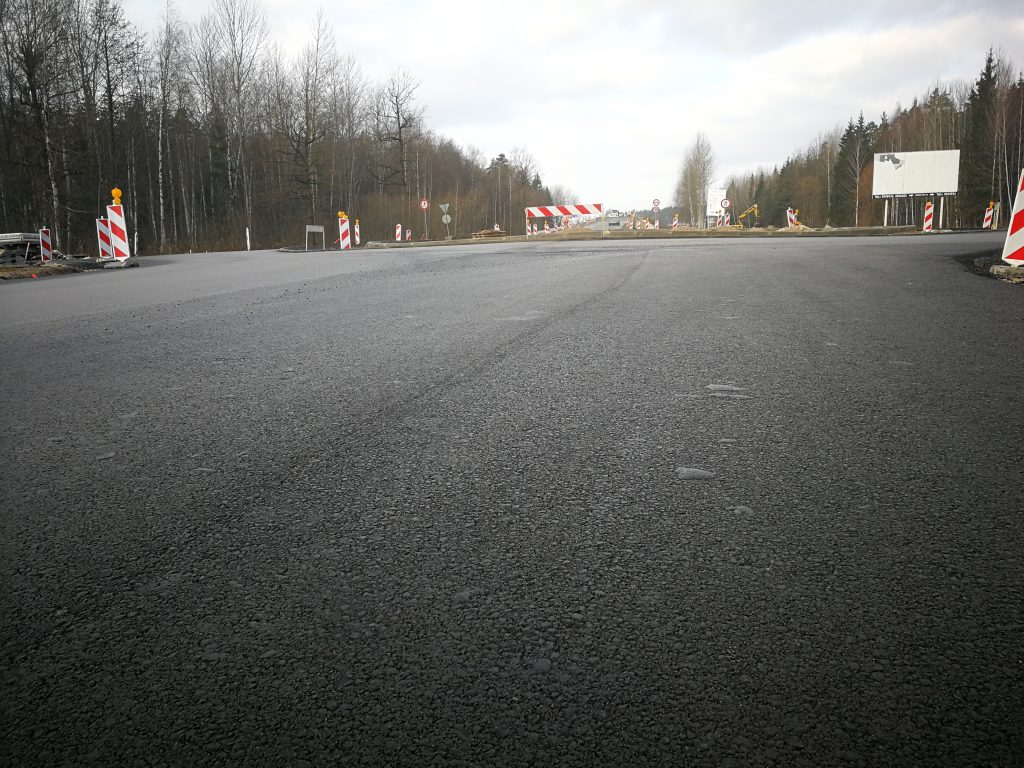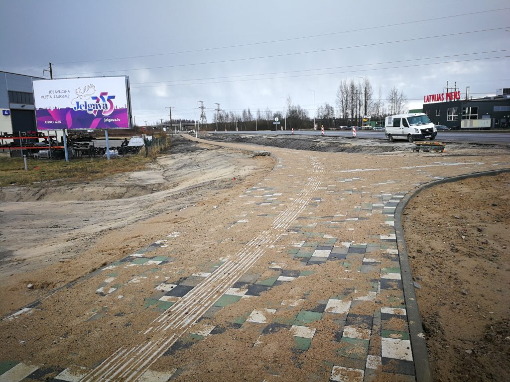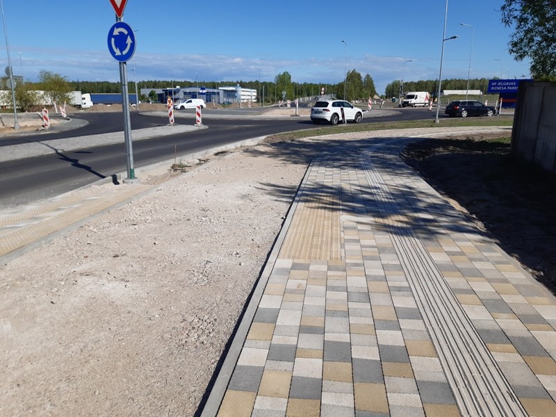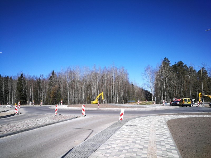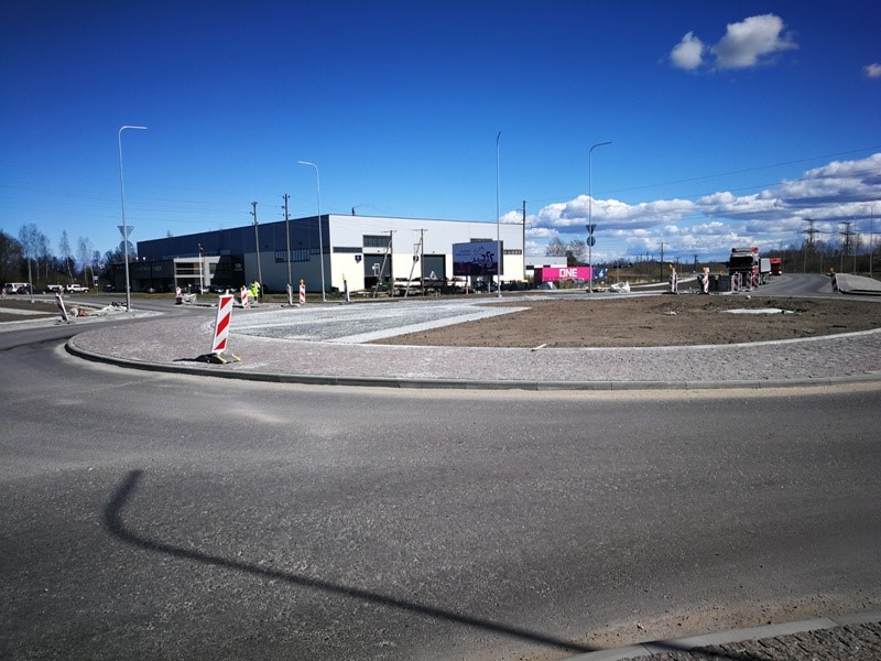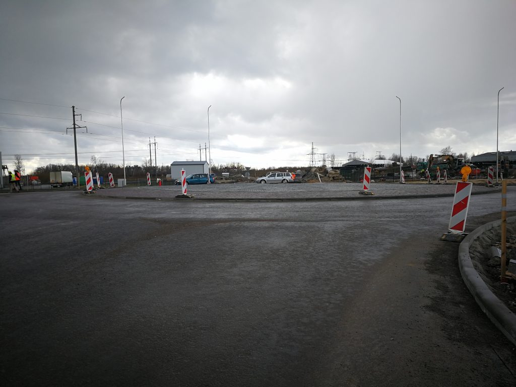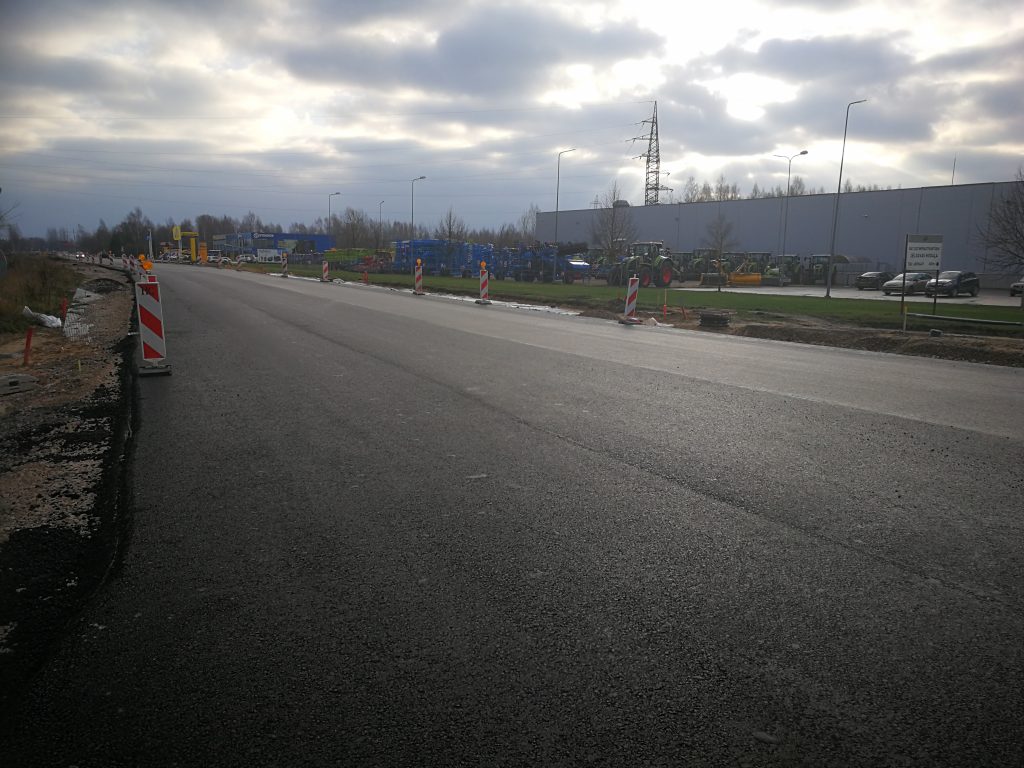 Turpinās brauktuves, ietvju un veloceliņa izbūves darbi, ietvju bruģēšana, izbūvētas rotācijas apļa saliņas, visā posmā ir ieklāts asfaltbetona segums, pārcelts NP biznesa parks reklāmas stends.