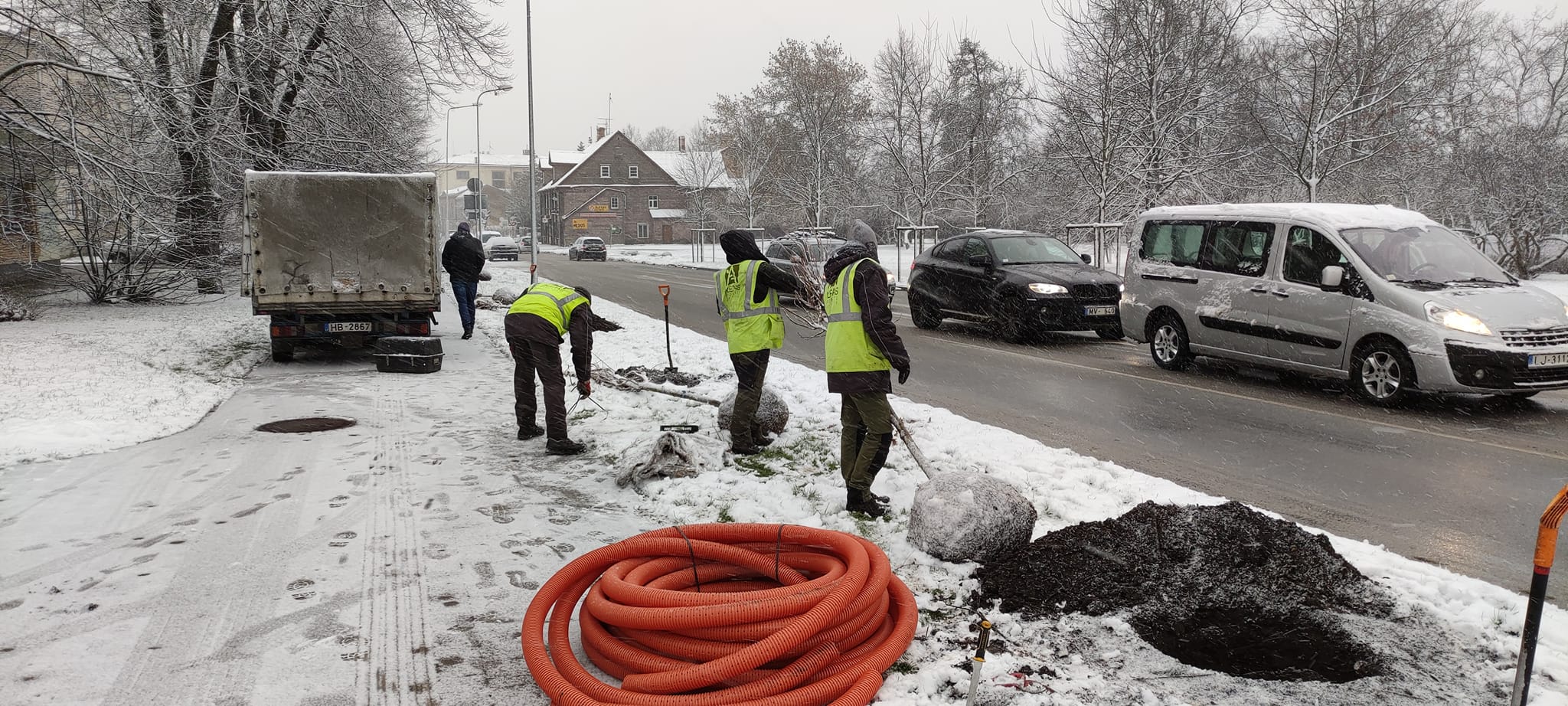 Iepriekšējās nedēļas nogalē tika sagatavotas stādvietas, nomainot grunti ar speciālu, pilsētā augošiem kokiem paredzētu substrātu. Pēc tam šajā bedrē tiek ievietota apūdeņošanas caurule, kas turpmāk kalpo koka laistīšanai sausākajā laikā. Pēc koka iestādīšanas uzstāda atbalsta mietus, atsaites un stumbra aizsargus.