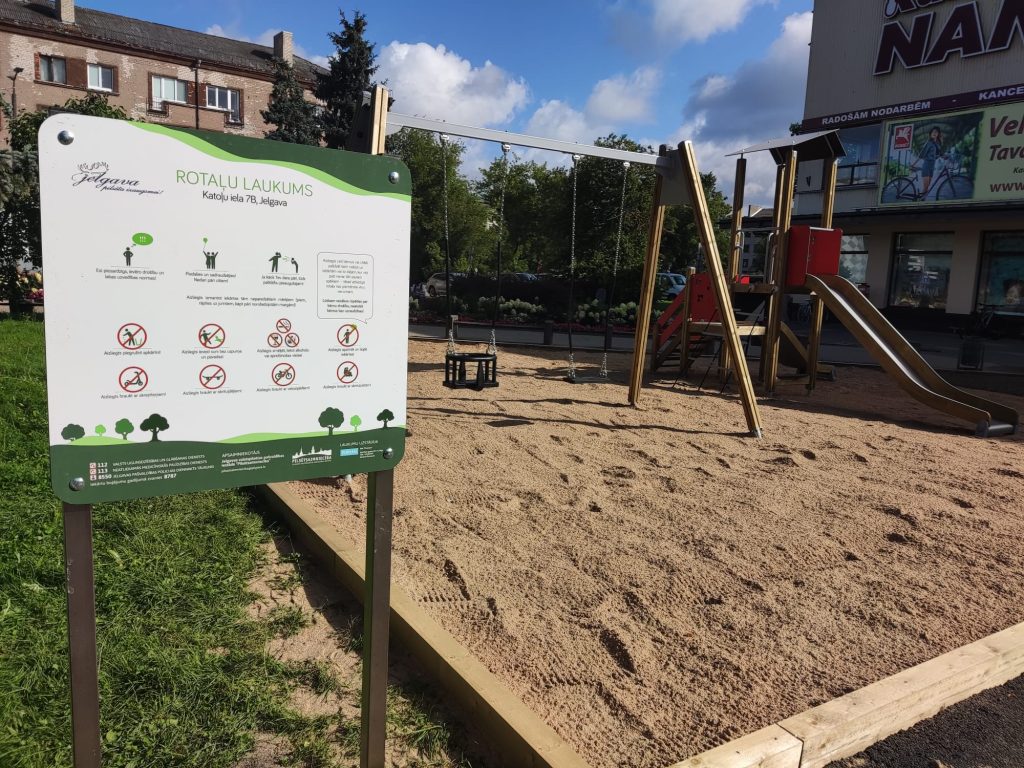 Laukumā ierīkots daudzfunkcionāls rotaļu komplekss, kas piemērots bērniem no 1 gada vecuma Rotaļu laukumā ierīkots daudzfunkcionālu rotaļu komplekss, kas piemērots bērniem no viena gada vecuma – tas sastāv no savā starpā savienotām platformām ar sieniņām, viena slidkalniņa lielākiem bērniem, viena slidkalniņa mazākiem bērniem, kāpnēm ar margām mazākiem bērniem, kā arī trošu trepēm. Papildu uzstādīts karuselis bērniem no trīs gadu vecuma, kurā vienlaikus var rotaļāties trīs bērni, šūpoļu rāmis ar diviem sēdekļiem, no kuriem viens paredzēts mazuļiem, kā arī zemē iebūvējams batuts ar gumijas mulču ap to, kā arī sakārtots smilšu segums. Atjaunotas arī laukuma koka apmales un uzstādīts jauns informācijas stends.