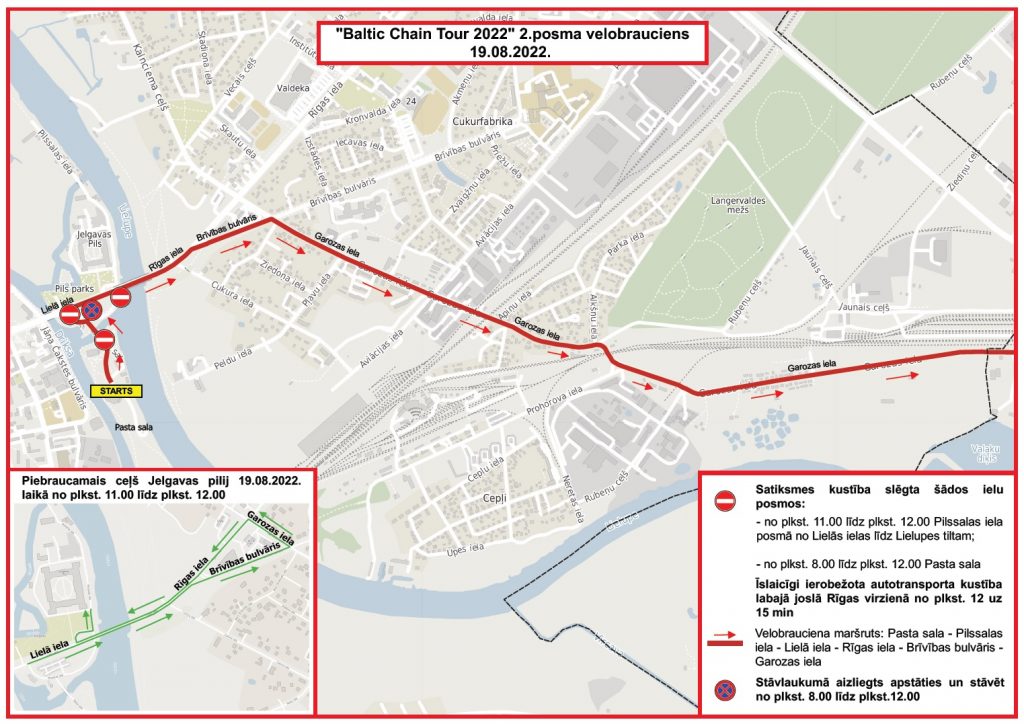 Piektdien, 19. augustā, ar posmu no Jelgavas līdz Siguldai tiks aizvadīts Starptautiskās Riteņbraukšanas savienības (UCI) 2. kategorijas daudzdienu velobrauciena “Baltic Chain tour” Latvijas posms. Iedzīvotājiem jārēķinās ar satiksmes ierobežojumiem Pasta salas apkārtnē: no pulksten 11 līdz 12 tiks slēgts Pilssalas ielas posms, no pulksten 8 līdz 12 satiksmei būs slēgta arī Pasta sala un stāvlaukums Pilssalas ielā 1, bet no pulksten 12 īslaicīgi tiks ierobežota autotransporta kustība labajā joslā Rīgas virzienā Rīgas ielā, Brīvības bulvārī un Garozas ielā.