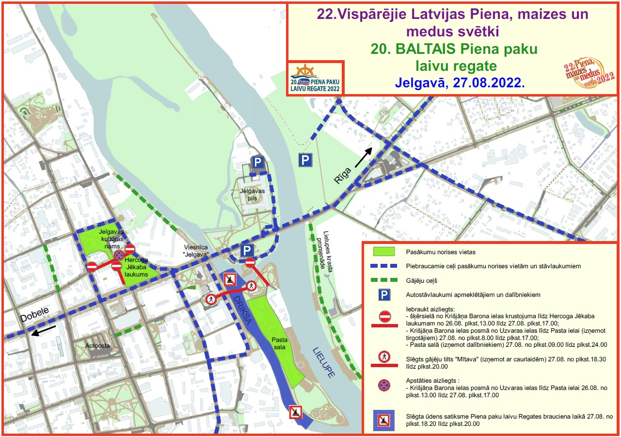 2022. gada 27. augustā notiks 22. Vispārējie Latvijas Piena, maizes un medus svētki, 20. “Baltais” piena paku laivu regate. Satiksme tiks organizēta saskaņā ar pievienoto shēmu.