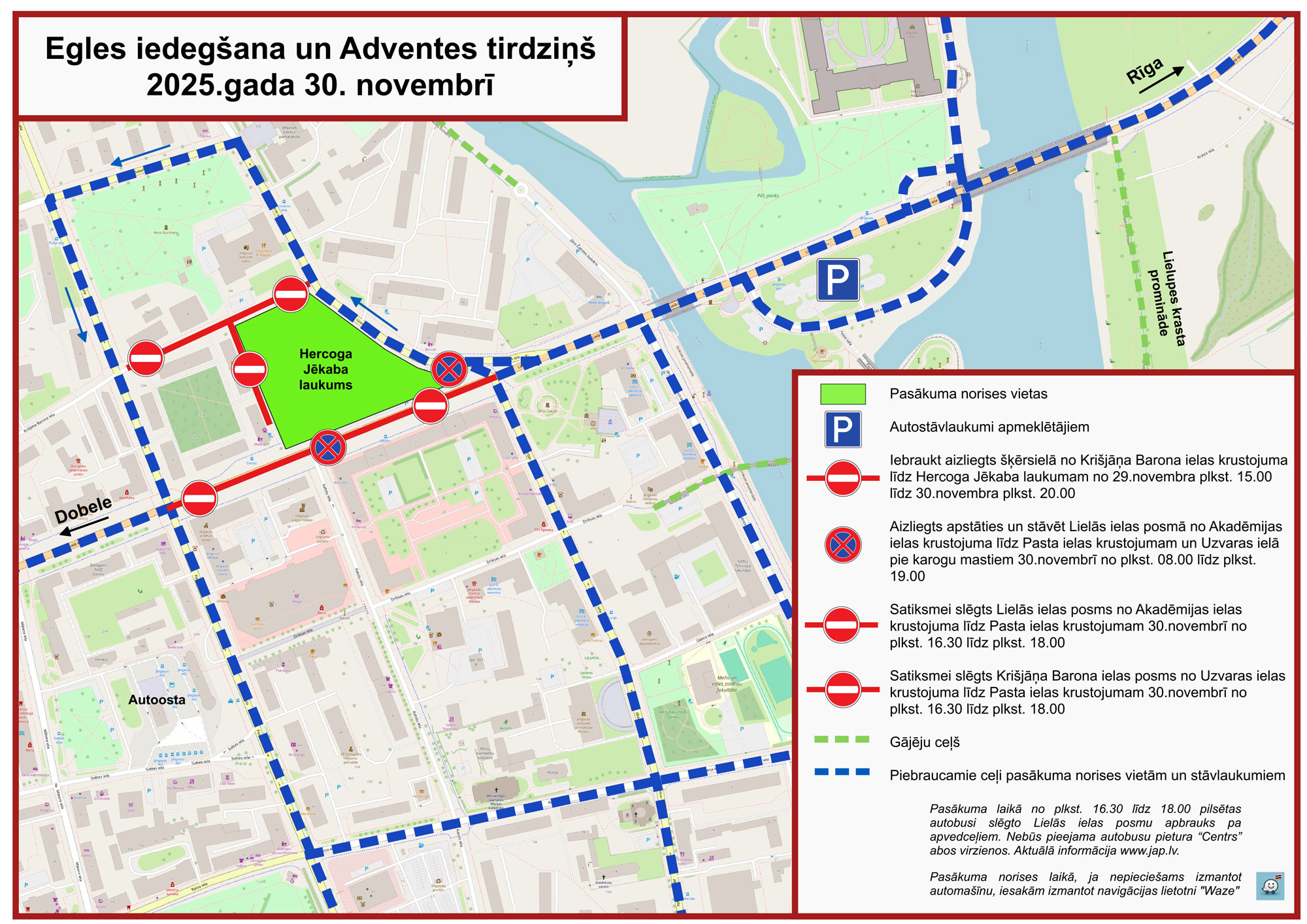 Satiksmes organizācija egles iedegšanas pasākumā 30. novembrī Pilsētas lielās egles iedegšana notiks Hercoga Jēkaba laukumā Pirmajā adventē, 30. novembrī. Akadēmijas ielaEgleHercoga Jēkaba laukumsLielā ielaUzvaras ielaDalītiesFacebookTwitterGoogle+PinterestLinkedIn Līdzīgi rakstiIerobežota satiksmes un gājēju kustība Mednieku ielā01.12.2025Slēgta satiksme Ošu ceļā (no Riekstu ceļa līdz 2.līnijai)01.12.2025Slēgta satiksmes kustība Ošu ceļā (no Riekstu ceļa līdz 1.līnijai) – Pagarinājums01.12.2025
