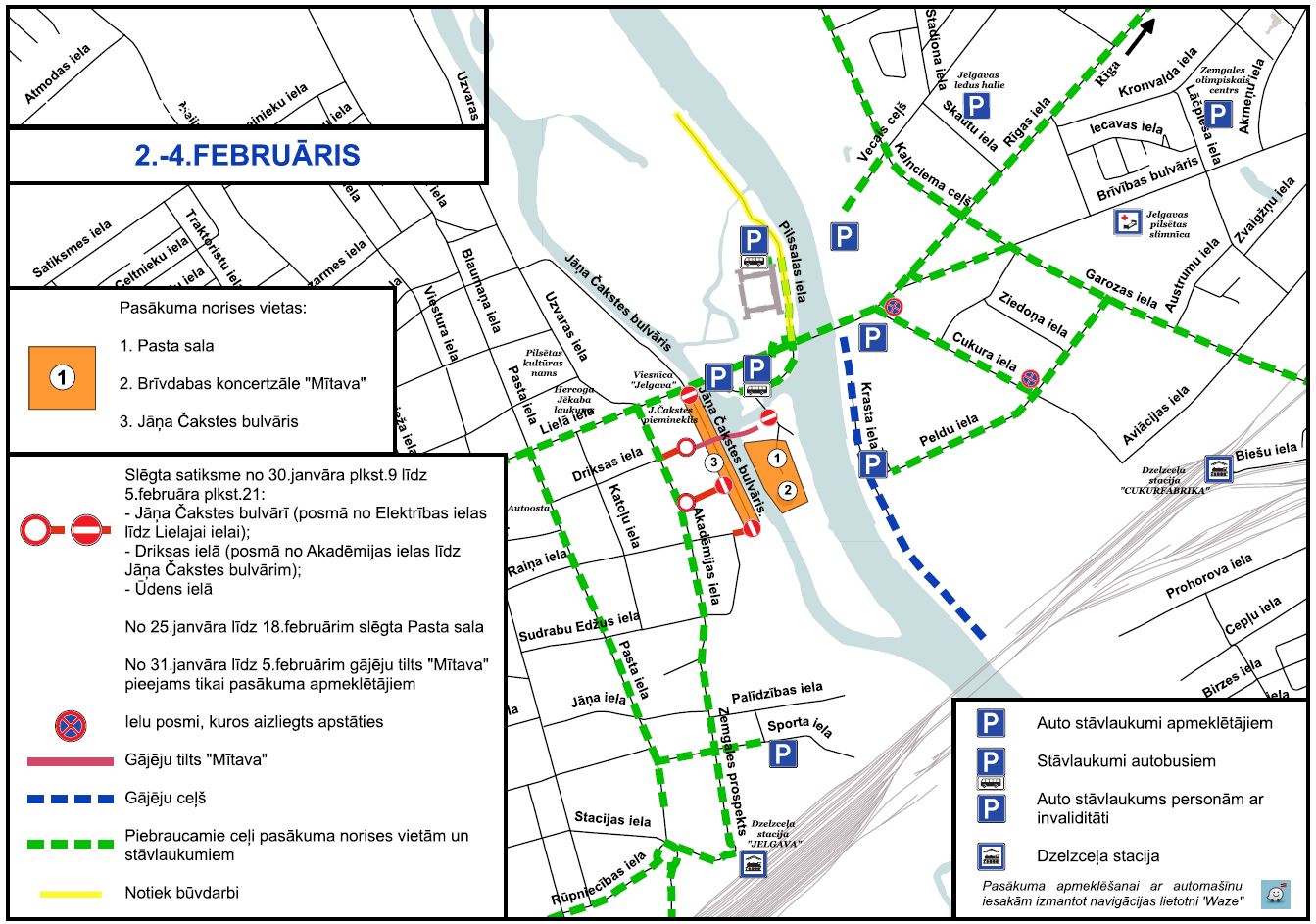 jau no 30. janvāra pulksten 9 līdz 5. februāra vakaram būs slēgta satiksme Jāņa Čakstes bulvārī posmā no Elektrības ielas līdz Lielajai ielai, Driksas ielā posmā no Akadēmijas ielas līdz Jāņa Čakstes bulvārim, kā arī Ūdens ielā. Tāpat no 31. janvāra līdz 5. februārim būs slēgts gājēju tilts “Mītava”, kas no 2. līdz 4. februārim būs pieejams tikai festivāla apmeklētājiem.