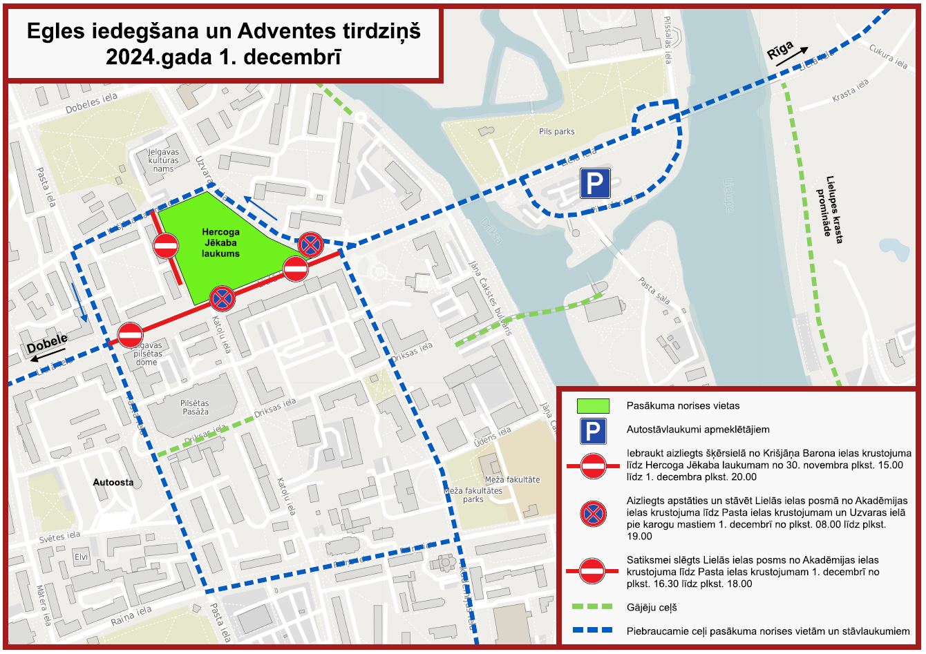 Egles iedegšanas pasākuma un tirdziņa laikā iedzīvotājiem jārēķinās ar satiksmes ierobežojumiem Hercoga Jēkaba laukuma apkārtnē.
