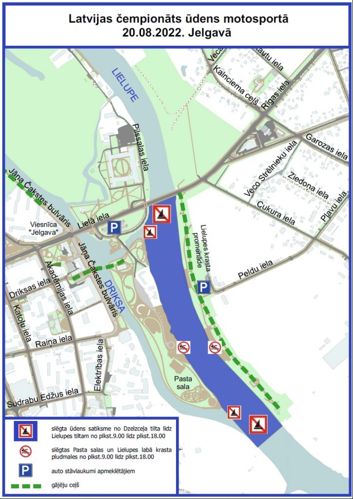 20.augustā no plkst.9:00 līdz plkst.18:00. slēgta ūdens satiksme Lielupes upē, posmā no Dzelzceļa tilta līdz Lielupes tiltam, slēgtas Pasta salas un Lielupes labā krasta pludmales.