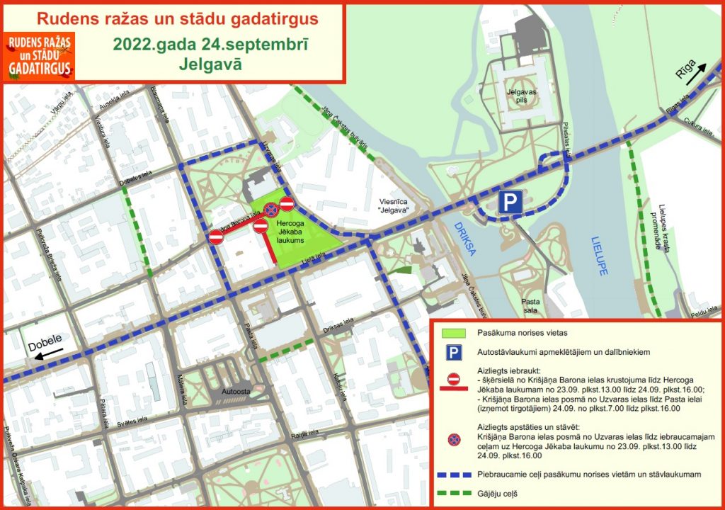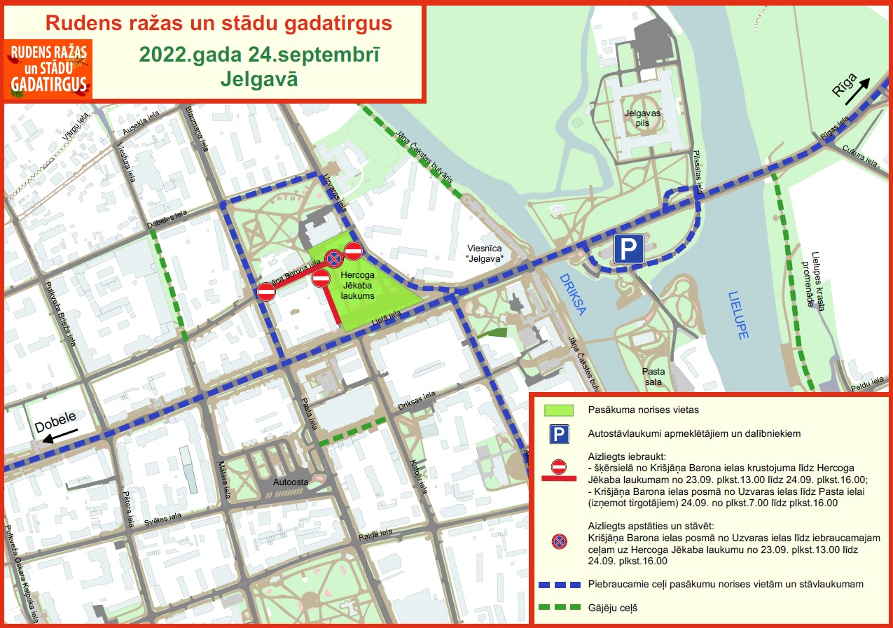 No 23. septembra plkst. 13:00 līdz 24. septembra plkst. 16:00 aizliegts apstāties un stāvēt Krišjāņa Barona ielas posmā no Uzvaras ielas līdz iebraucamajam ceļam uz Hercoga Jēkaba laukumu.