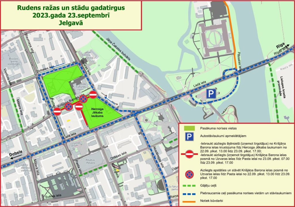 Satiksmes organizācija Rudens ražas gadatirgus laikā 23. septembrī norisināsies Rudens ražas gadatirgus. Satiksmes organizācijas shēma pasākuma laikā: Satiksmes organizācija Rudens ražas gadatirgus laikā Hercoga Jēkaba laukumsKrišjāņa Barona ielaSatiksmes ierobežojumiSvētku nodrošināšanaDalītiesFacebookTwitterGoogle+PinterestLinkedIn Līdzīgi rakstiIerobežota satiksmes un gājēju kustība Mednieku ielā01.12.2025Slēgta satiksme Ošu ceļā (no Riekstu ceļa līdz 2.līnijai)01.12.2025Slēgta satiksmes kustība Ošu ceļā (no Riekstu ceļa līdz 1.līnijai) – Pagarinājums01.12.2025