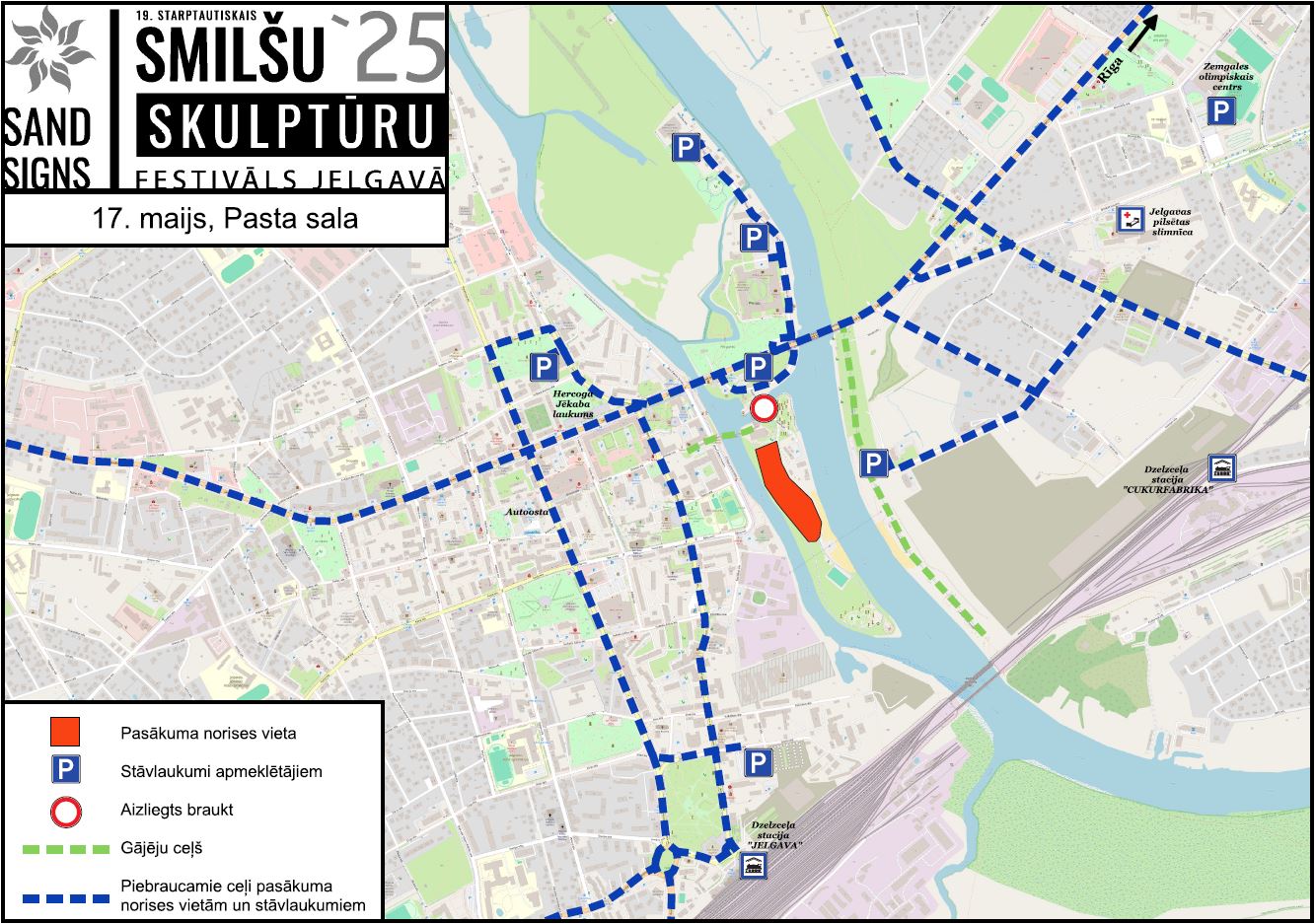 Satiksmes organizācija Smilšu skulptūru festivāla laikā Satiksmes organizācijas shēma Smilšu skulptūru festivāla laikā 17. maijā. Satiksmes ierobežojumi Smilšu skulptūru festivāla laikā Satiksmes ierobežojumiSmilšu skulptūru festivālsDalītiesFacebookTwitterGoogle+PinterestLinkedIn Līdzīgi rakstiIerobežota satiksme un gājēju kustība Dobeles šosejas un Atmodas ielas krustojumā – Pagarinājums16.12.2025Slēgta satiksmes kustība Ošu ceļā (no Riekstu ceļa līdz 1.līnijai, pagarinājums)16.12.2025Satiksmes organizācija pie Zemgales Olimpiskā centra 27. decembrī16.12.2025
