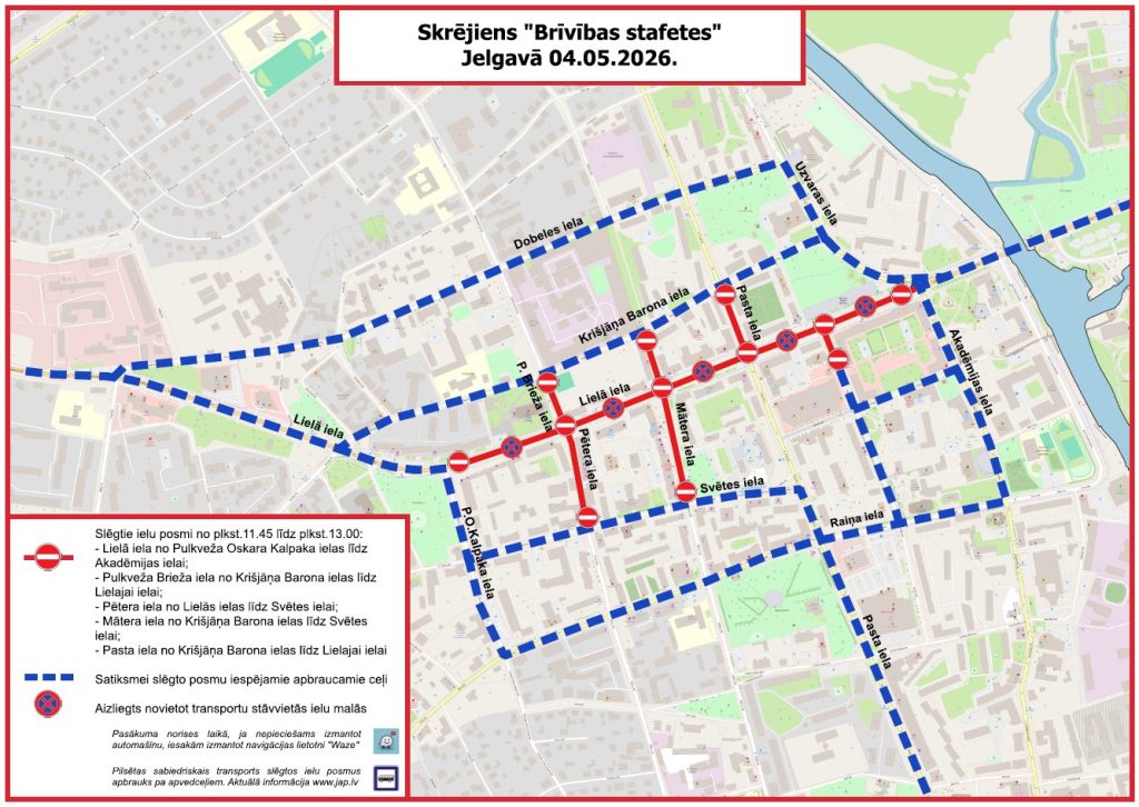 No pulksten 11.45 līdz 13.00 satiksmei būs slēgti šādi ielu posmi: