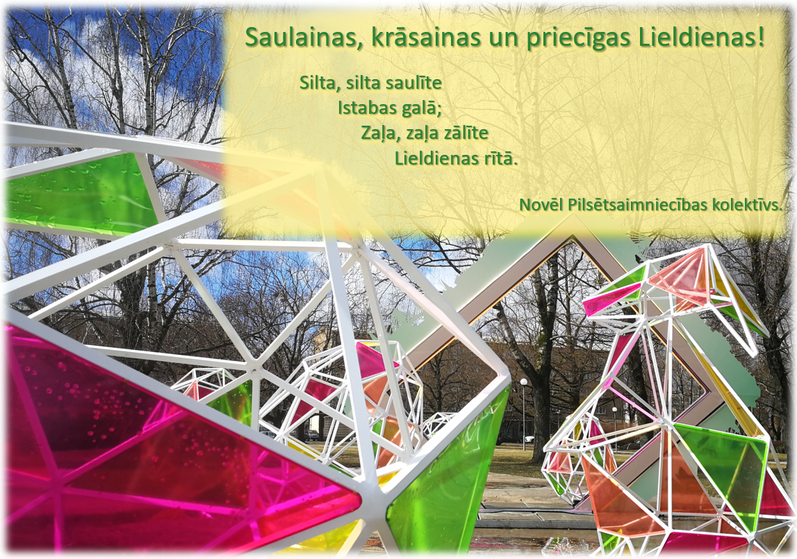 Saulainas, krāsainas un priecīgas Lieldienas! PilsētsaimniecībaDalītiesFacebookTwitterGoogle+PinterestLinkedIn Līdzīgi rakstiInformācija par JVPI “Pilsētsaimniecība” cenu aptaujām publicēta iestādes tīmekļvietnē10.12.2025Apsveikums Latvijas Republikas Proklamēšanas dienā14.11.2025Mirušo piemiņas diena – 23. novembrī21.10.2025