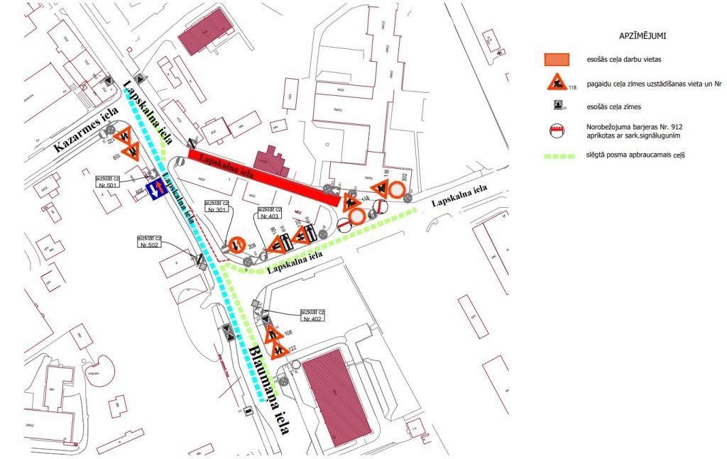 No 13. novembra līdz 17. novembrim slēgta satiksme Lapskalna ielā, posmā no Lapskalna iela Nr. 2 līdz Lapskalna iela Nr. 6, būvdarbu laikā – lietus kanalizācijas sistēmas remontdarbi, ievērojot saskaņoto Satiksmes organizācijas shēmu.