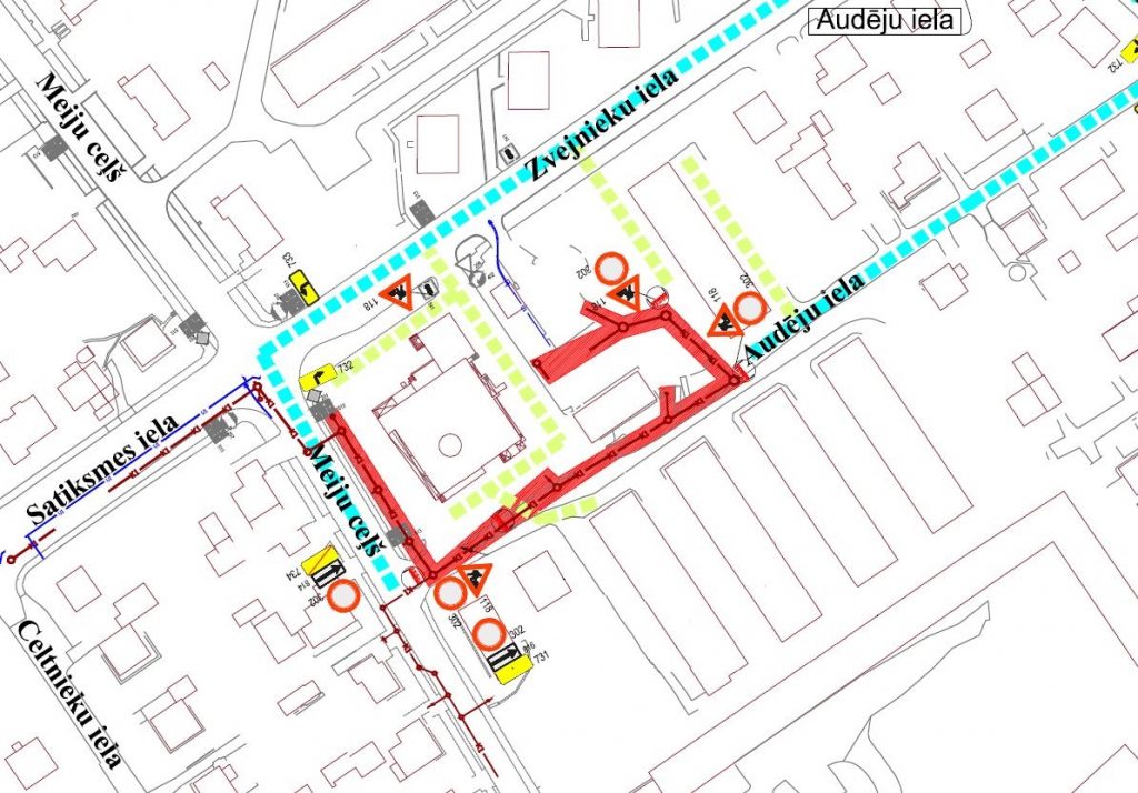 Termiņa pagarinājums. Līdz 31. oktobrim slēgta satiksme Meiju ceļā, posmā no Satiksmes ielas līdz Pionieru ielai un Audēju ielā, posmā no Meiju ceļa līdz Kārļa ielai, būvdarbu laikā – ūdens un kanalizācijas tīklu ierīkošana, ievērojot saskaņoto Satiksmes organizācijas shēmu.