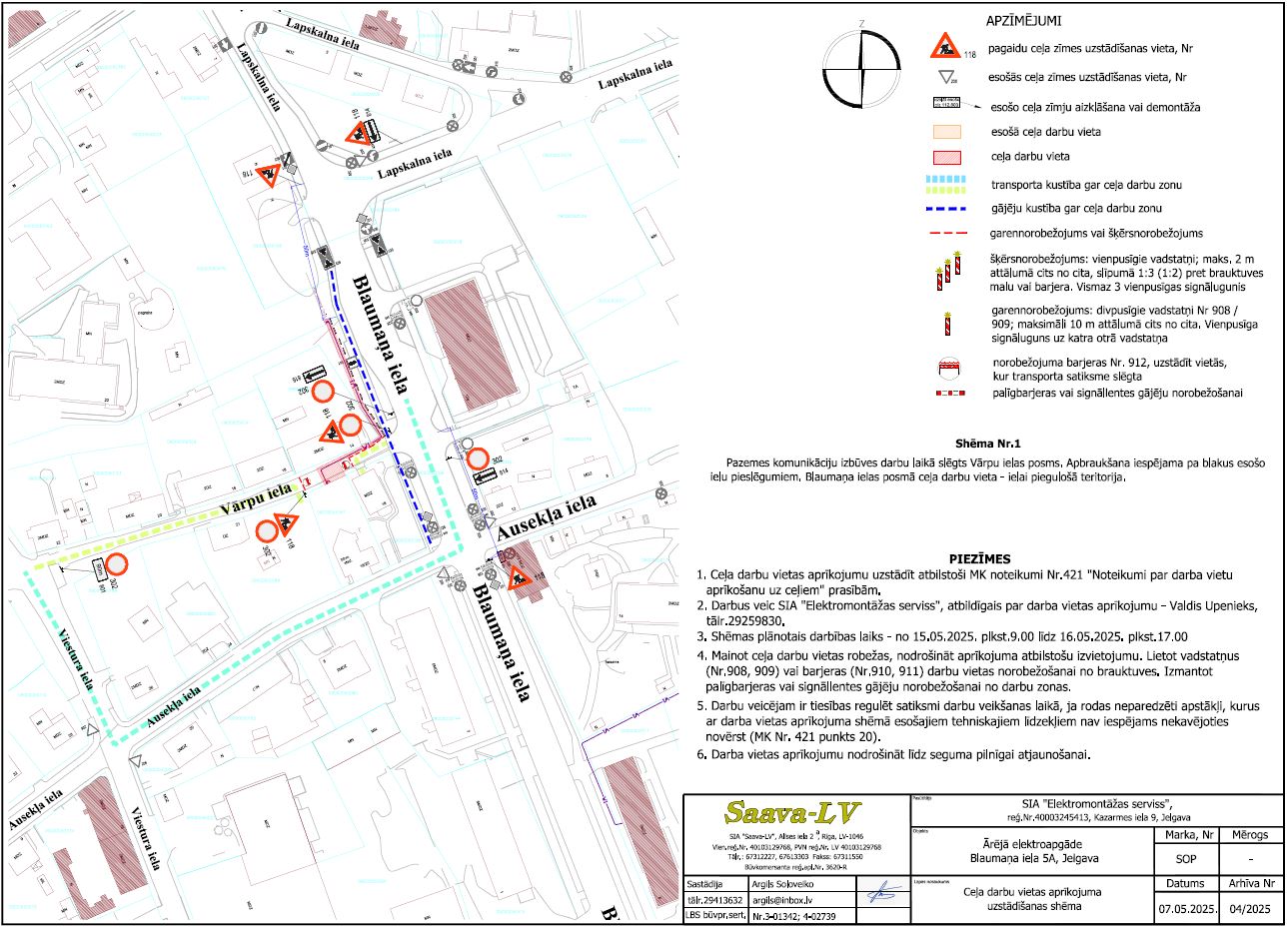 Darbu izpildītājs, atbildīgais par satiksmes organizāciju: SIA „Elektromontāžas serviss”, kontakttālrunis 27839698.