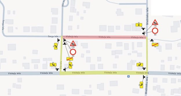 Līdz 30. maijam slēgta satiksme Vizbuļu ielā, posmā no Sila ielas līdz Sargu ielai un Sargu ielā, posmā no Vizbuļu ielas līdz Ķeguma ielai, būvdarbu laikā – ūdens un kanalizācijas tīklu ierīkošana, ievērojot saskaņoto Satiksmes organizācijas shēmu.