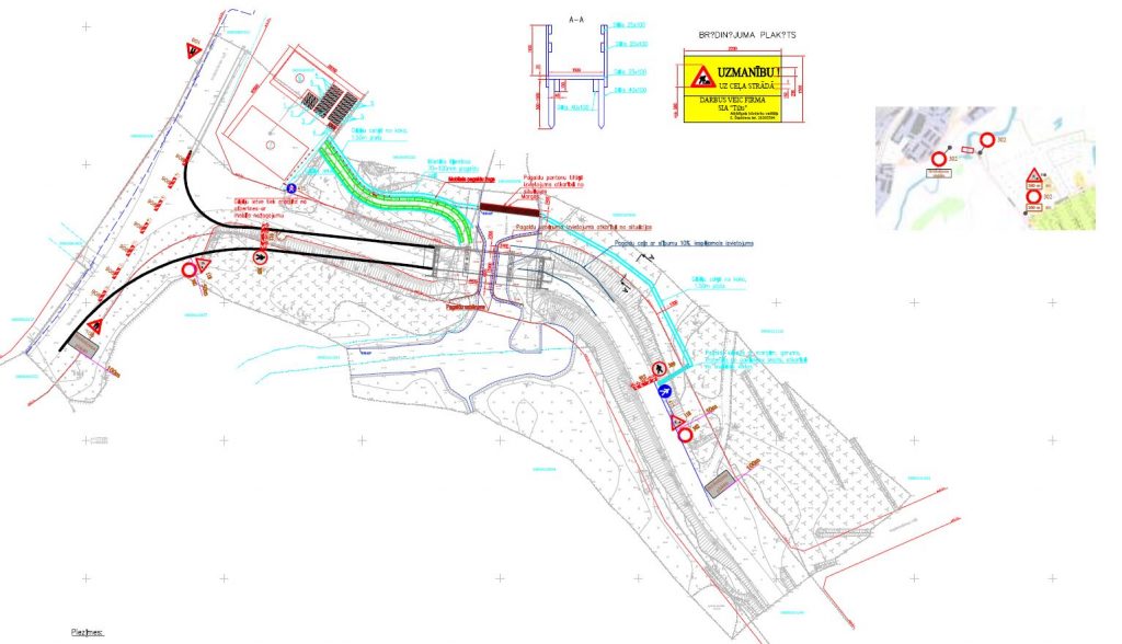Aktualizēta satiksmes organizācijas shēma, mainot gājēju celiņa ieliekumu, lai varētu izveidot uzbērumu un veikt jaunās trases nospraušanu pieslēgumam pie Bauskas ielas.