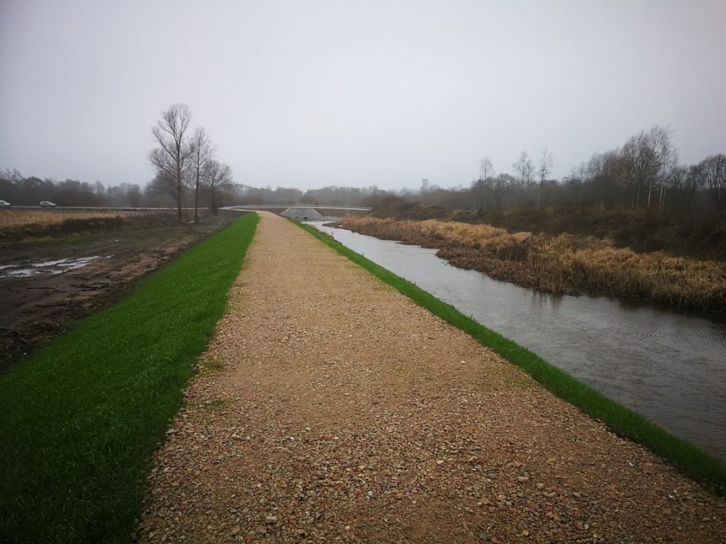 Sniega ielai piegulošajās pļavās laipu izbūvi veic SIA “Ceļu būvniecības sabiedrība “Igate”” Eiropas Reģionālā attīstības fonda projekta „Kompleksu pasākumu īstenošana Svētes upes caurplūdes atjaunošanai plūdu apdraudējuma samazināšanai piegulošajās teritorijās” 1.daļas „Zaļās infrastruktūras izveidošana Sniega ielas piegulošajās teritorijās” ietvaros.