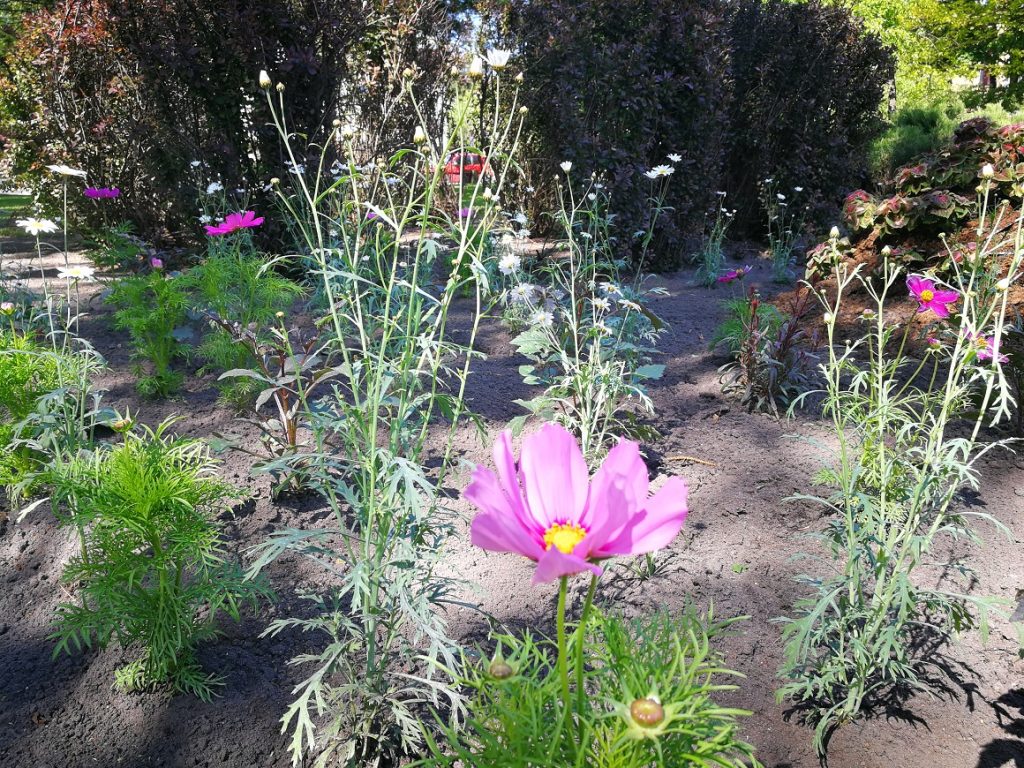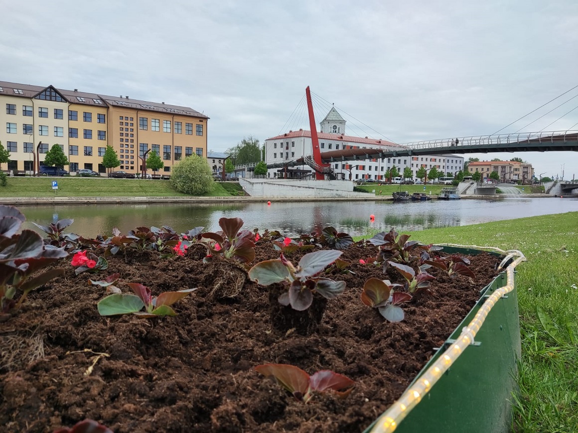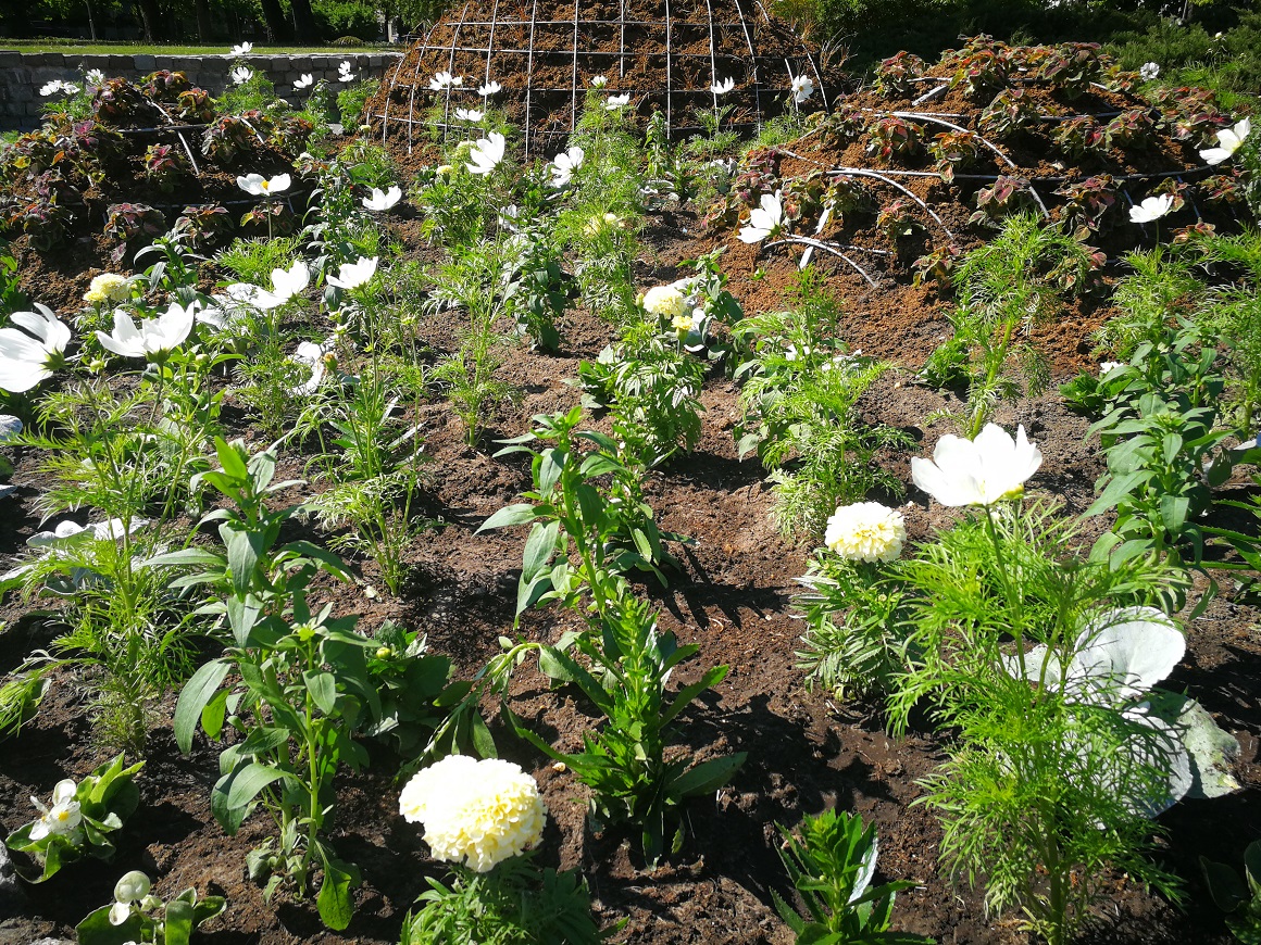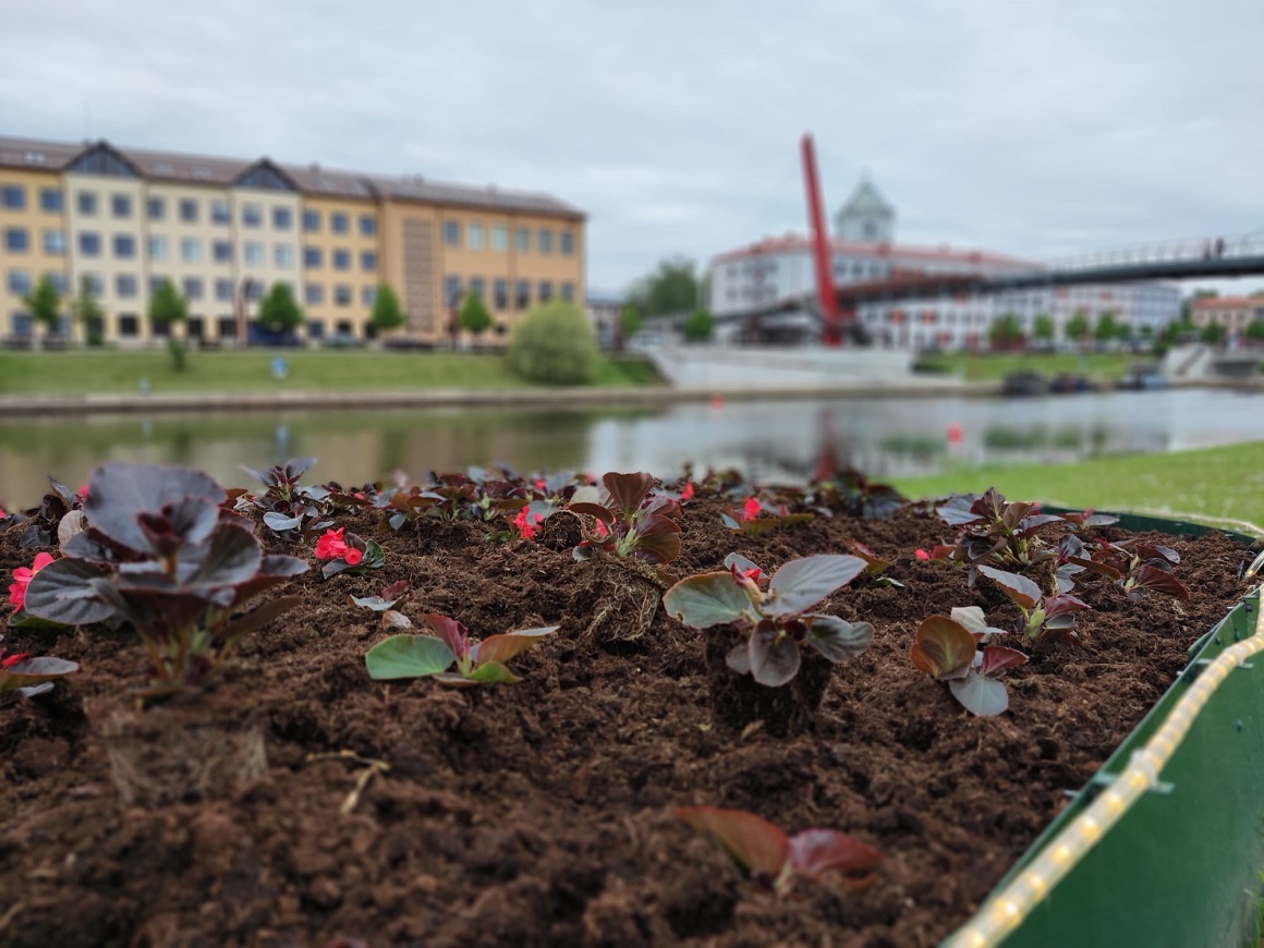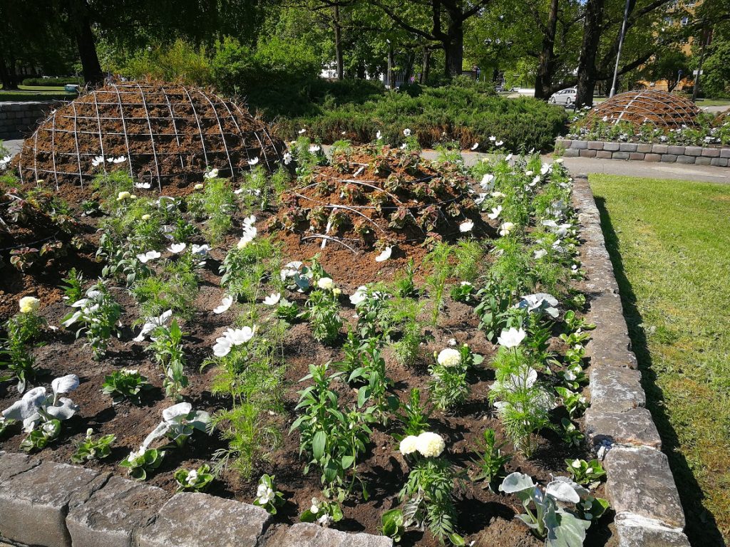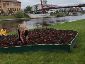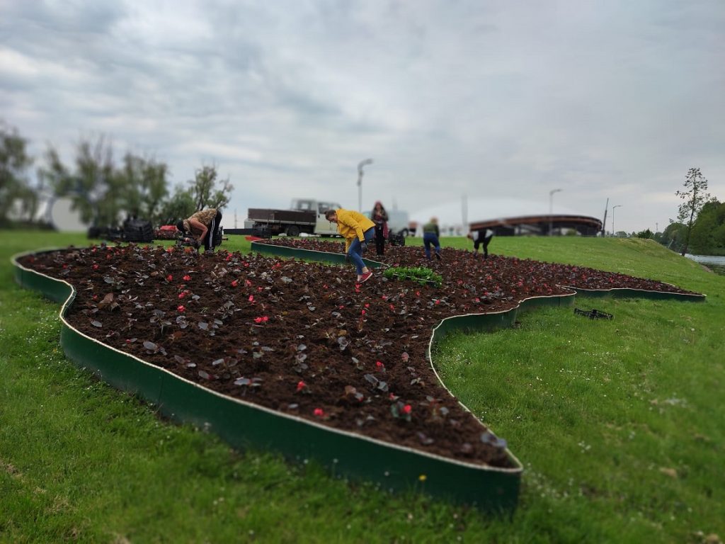 Turpinās vasaras puķu stādīšana, Pasta salas dobē ar Latvijas kartes kontūru iestādītas 2000 augstās leduspuķes