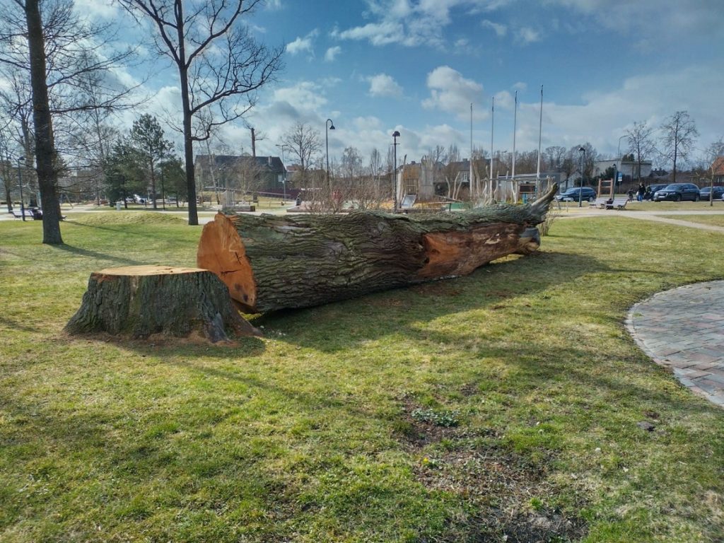 Uzvaras parkā nozāģēts nokaltušais ozols