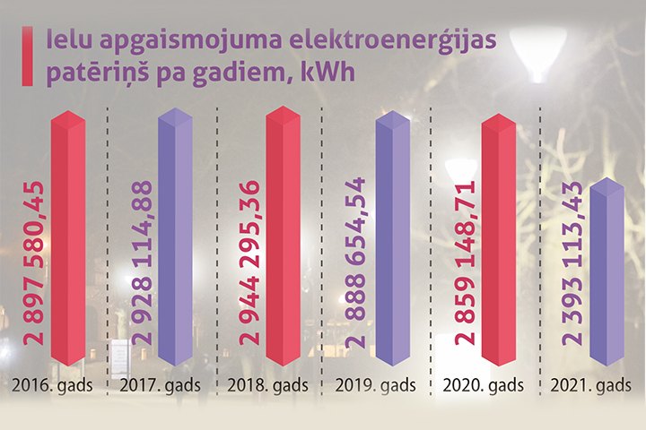 Pēc pašvaldības iestādes “Pilsētsaimniecība” aprēķina, ielu apgaismojuma elektroenerģijas patēriņa samazinājums 2021. gadā, salīdzinot ar 2020. gadu, pilsētā bija 466,035 megavatstundas, bet CO2 ietaupījums – 50,798 tonnas. Savukārt kopējā ielu apgaismojuma elektroenerģijas izmaksu starpība 2020. un 2021. gadā ir 17 556,73 eiro, un tas ir ietaupījums, rēķinot pēc pašreizējās elektroenerģijas cenas.