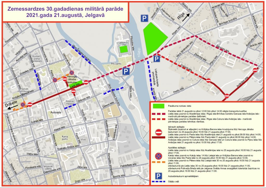 Sestdien, 21. augustā, Jelgavā notiks Zemessardzes 30. gadadienas svinības. Lai mazinātu ar šo pasākumu saistīto satiksmes ierobežojumu ietekmi uz pilsētas transportu un iedzīvotājiem, 18.augustā Zemessardzes parādes dalībnieki un parādes tehnikas vienības ieradīsies Jelgavas lidlaukā patstāvīgi, ievērojot ceļu satiksmes noteikumus un pēc iespējas netraucējot satiksmes plūsmu. No 18.augusta līdz 20.augustam lidlauka teritorijā norisināsies parādes mēģinājums, militāro vienību un transporta līdzekļu izvietošana un nometnes vietas ierīkošana. Teritorija tiks apsargāta.